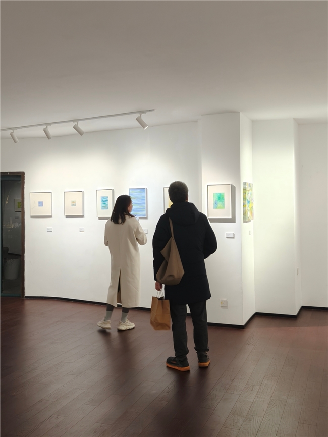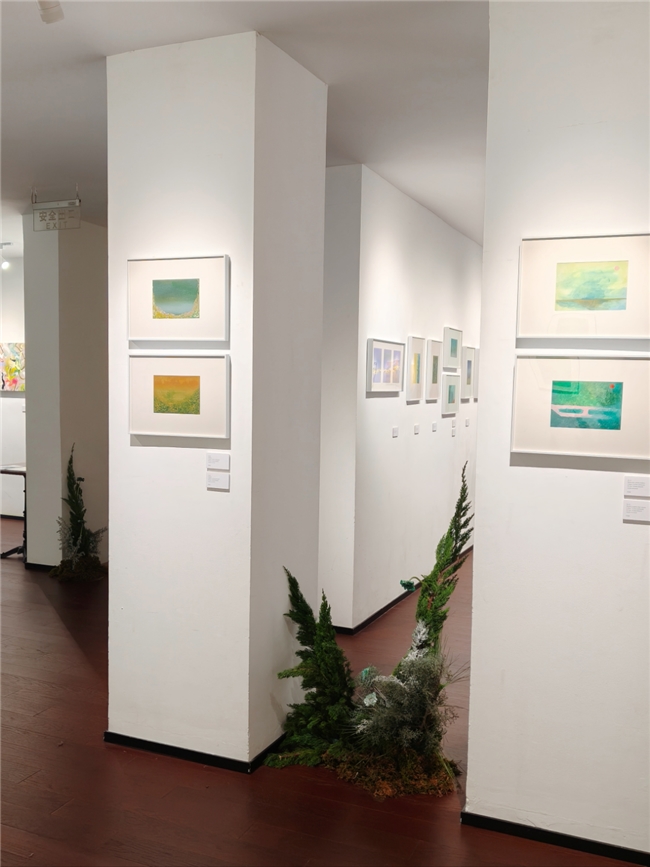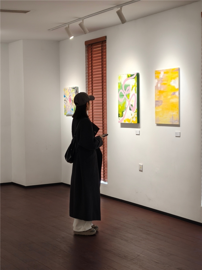 展览中的作品以抽象表现主义为语言,却处处可见自然的影子。连绵的山峦、繁茂的树木、流动的云气、灵动的飞鸟,都被她提炼为色彩与笔触的交响。画面以不同层次的绿色为基调,辅以沉静的蓝色、灵动的白色/浅色,以及偶尔跳跃的黄色、橙色,共同构建出一种宁静、深邃、生机勃勃又略带神秘感的整体氛围。